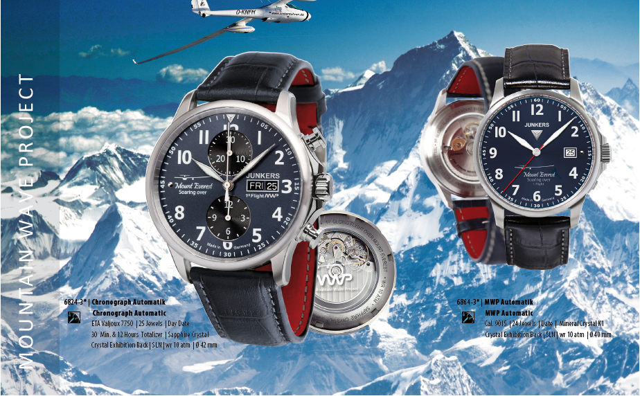 Mountain wave project峰流计划,由两名具有非凡勇气的飞行员驾驶滑翔机,在低至零下46度的寒冷条件下飞越珠穆朗玛峰。该活动由荣克表赞助,并与德国航天局(DLR)联手,旨在完成对山峰的首次3D测量,从而为科学活动提供更多依据,当中更是包括为登山者规划最佳的救援路线。荣克非凡的自动机械码表“珠穆朗玛峰”,是专为此次计划而设计。其醉人的深蓝表盘,恰似包围这地球最高峰的迷人天空。